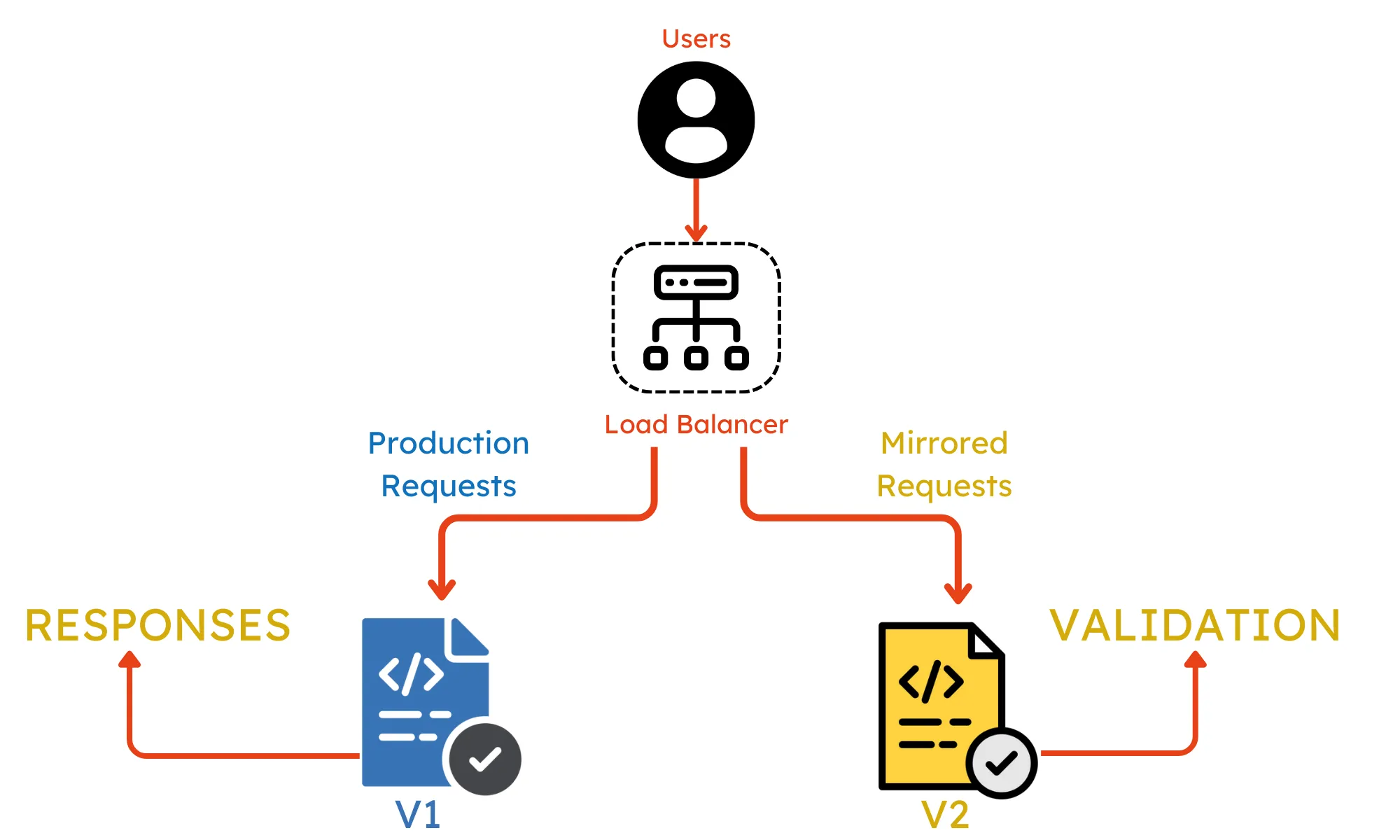 In a shadow deployment, you deploy the new version alongside your current production system. Every request that comes to your system gets processed by both versions. Users receive responses only from the stable version, while responses from the new version are logged and analyzed but never used. This lets you test how the new version behaves under real production load and compare its performance to the current version without any user impact.