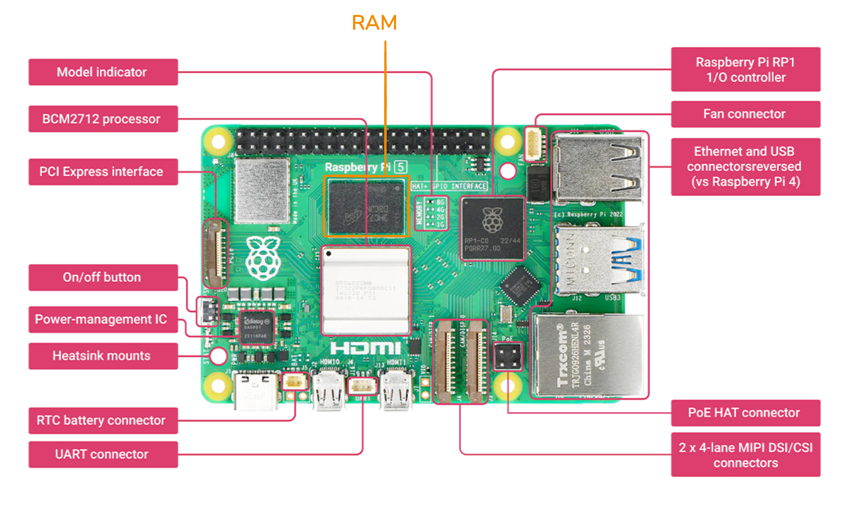 To start, we have CPU in the center-left of the board (labelled BCM2712 processor in the figure). Worth noting that like most modern CPUs, this CPU has multiple cores: like multiple chefs working together.