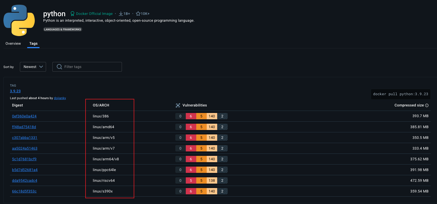 A quick way to check if an image supports your architecture: look at the image’s Docker Hub page. For example, the official Python image shows supported platforms including linux/amd64 (x86), linux/arm64 (64-bit ARM like Raspberry Pi 4/5), and linux/arm/v7 (32-bit ARM like older Pis). If your architecture isn’t listed, you’ll need to build the image yourself or find an alternative.